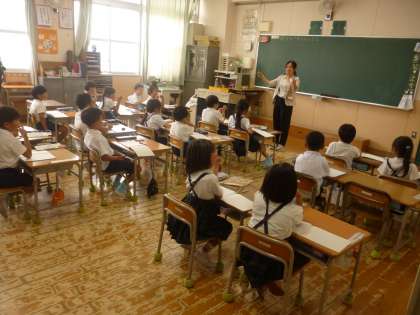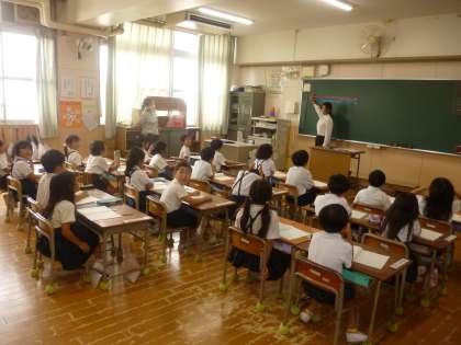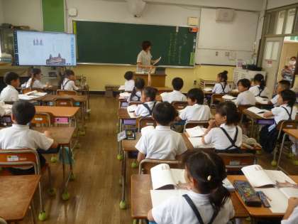 9月5日(金)5時限目、学習参観がありました。昨夜から接近してきた台風の影響は少なく、無事に実施できました。写真は、1年生が算数科「どちらが ながい」、2年生が国語科「ニャーゴ」を学習している様子です。