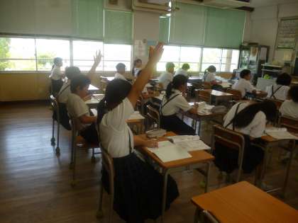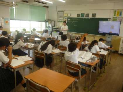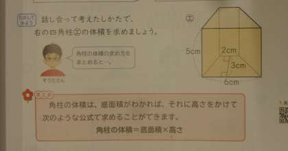 6年2組では算数科の時間に、まず三角柱の体積を求めました。次は次のような問題、ご角柱の体積を求めます。考え方は、三角柱での体積の求め方と同じなのですが……。