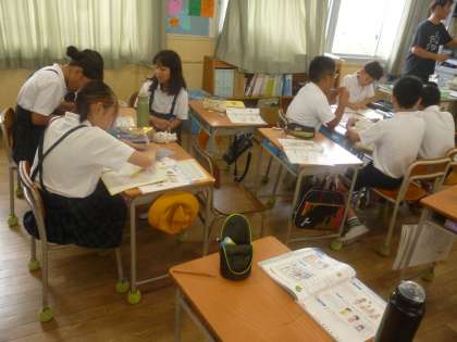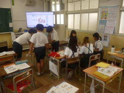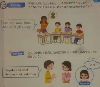5年1組では「友だちのできることやできないことを伝え合おう」を学習しています。「He can 〇〇.」「He can’t ●●.」グループで集まって、お友だちができることやできないことでクイズを作っていました。「cook」「play swimming」など、いろいろな単語を使ってクイズを考えていました。