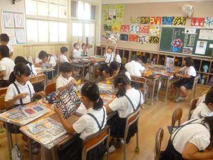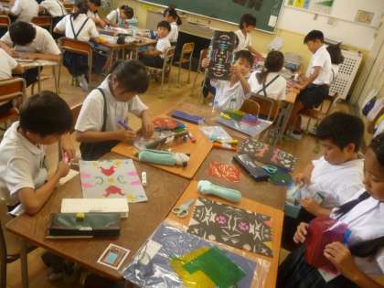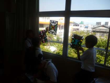 4年生では「光のさしこむ絵」に取り組んでいました。黒画用紙をくり抜いて作ったフレームに裏から色セロファンを貼っていました。窓際にかざして、日光が通り抜ける具合を楽しんでいました。