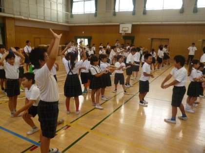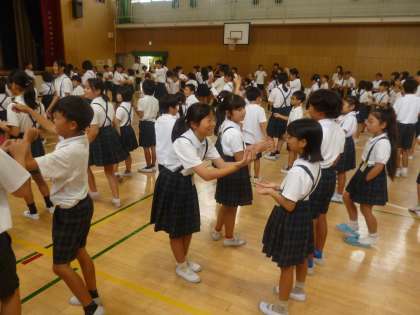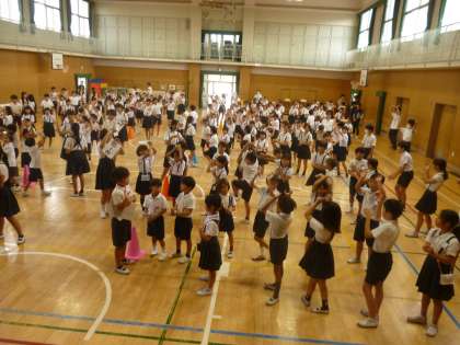 児童集会 公開日 2025/09/25 更新日 2025/09/25 その他 9月25日(木)の児童集会は「落ちた落ちたゲーム」をしました。前で集会委員児童が「落ちた落ちた。」と言うと、みんなが「何が落ちた。」と尋ねます。集会委員が「〇〇!」と答えると、みんなが落ちた品物に合わせたポーズをとります。 最初は「リンゴ」「かみなり」が落ちていましたが、「パソコン」「たらい」「傘」のように、ポーズが撮りにくい品物も落ちてきました。 集会委員のみなさん、楽しいゲームをありがとうございました。 いいね(0)