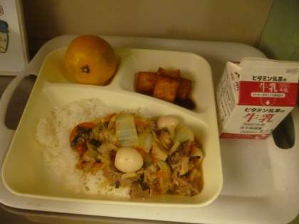 10月21日(火)の給食は、中華丼・牛乳・厚揚げの中華だれかけ・みかんです。中華丼は卵のアレルギー対応除去食になっています。