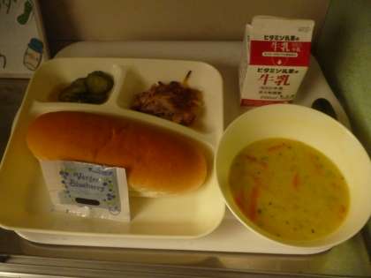 10月22日(水)の給食は、コッペパン・ブルーベリージャム・牛乳・豚肉のガーリック焼き・コーンスープ・きゅうりのバジル風味サラダです。