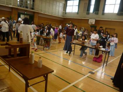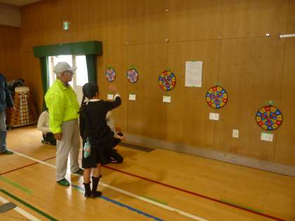 体育館では、「まとあて」と「しゃてき」、「フリースロー」がありました。