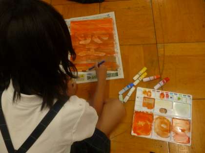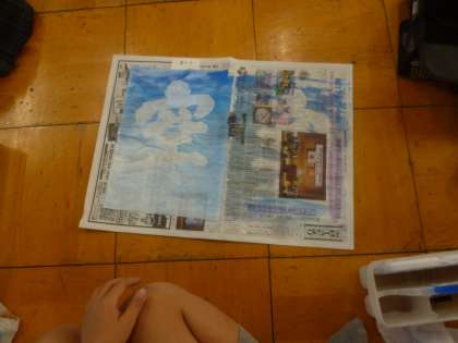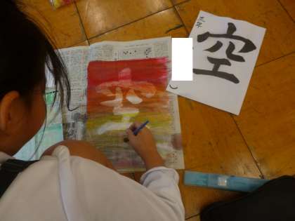 空を自由に連想して塗った半紙に、「空」の文字が浮かび上がっていました。