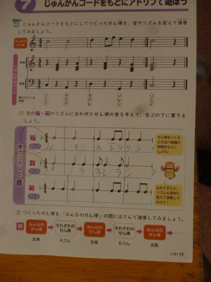 6年 じゅんかんコードをもとにアドリブで遊ぼう 公開日 2025/10/30 更新日 2025/10/30 6年 6年1組では音楽科「じゅんかんコードをもとにアドリブで遊ぼう」に取り組んでいました。「ソミド」「ラミド」「ラファレ」……、循環コードをもとにして、(ア)は「ター・ター・タンタタ・タンタン」このリズムに合わせて音を当てはめて旋律を作っていいました。 次は、それぞれが作った旋律を順に演奏していくようです。きれいな旋律が続くことでしょう。 いいね(0)