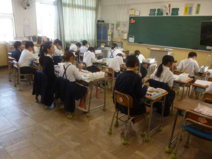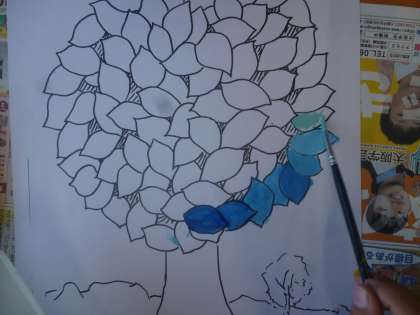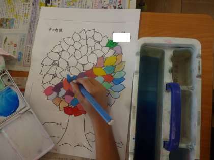 5年2組では図画工作科「色の勉強」に取り組んでいました。画用紙には木の葉がたくさん茂った絵が載っています。同じ色は使わず全ての木の葉に色を塗っていかなくてはいけません。混色を巧みに利用すればいいようですが、中には、微妙に色合いを変えた青色系や緑色系ばかり塗ろうと努めている児童もいました。
