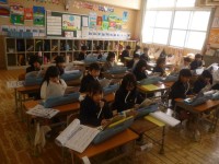 1年1組では書写「みみずの たいそう」に取り組んでいました。まず詩を音読して、次は詩のリズムに合わせて実際に体操をしました。いよいよ書写です。今回は赤線を丁寧になぞります。