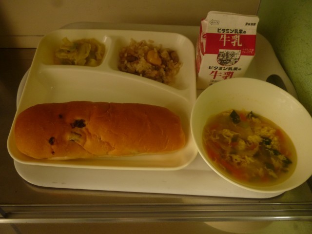 2月27日(金)の給食は、レーズンパン・牛乳・中華おこわ・卵スープ・キャベツのオイスターソース炒めです。卵スープは卵のアレルギー対応除去食になっています。