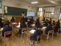 3年2組では書写「そら」に取り組んでいました。「そ」は筆を運ぶ方向が次々に変わりますが、その都度穂先の向きに気を配らなければいけません。