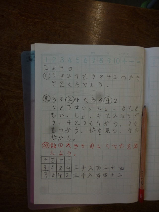 2年生は算数科の時間に、「3842」と「3824」の大きさの比べ方について話し合っていました。はたして、千の位を比べればいいのでしょうか?百の位を比べればいいのでしょうか?それとも……。