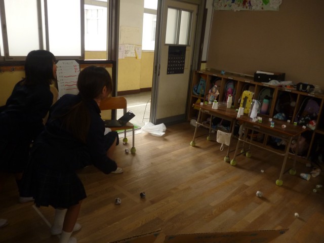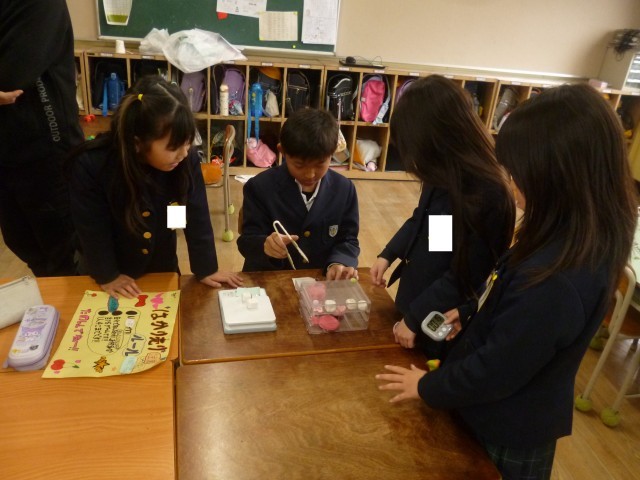 後半は、2組が作ったおもちゃで1組が遊びます。「ぴょんぴょんうさぎ」「???※お楽しみに」「じしゃく車きょう走」「宝さがしビー玉ころがし」「はかり売り」「紙コップをたおせ!」のコーナーがありました。