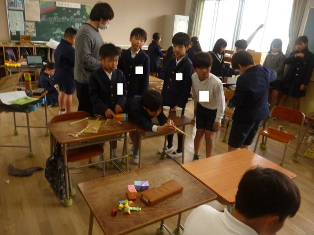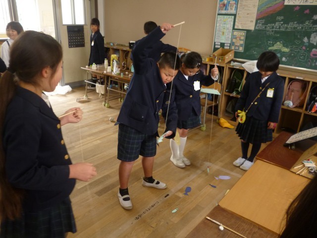 3年生は理科で学習したことを利用して作った「おもちゃランド」に取り組んでいました。前半は、1組が作ったおもちゃで2組が遊びます。「しゃてきイカゲーム」「ゴーストハント」「ピヨのたつじん」「カラフルはてなボックス」「魚つりゲーム」「まとあて」のコーナーがありました。