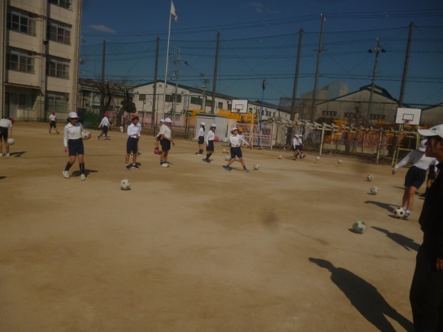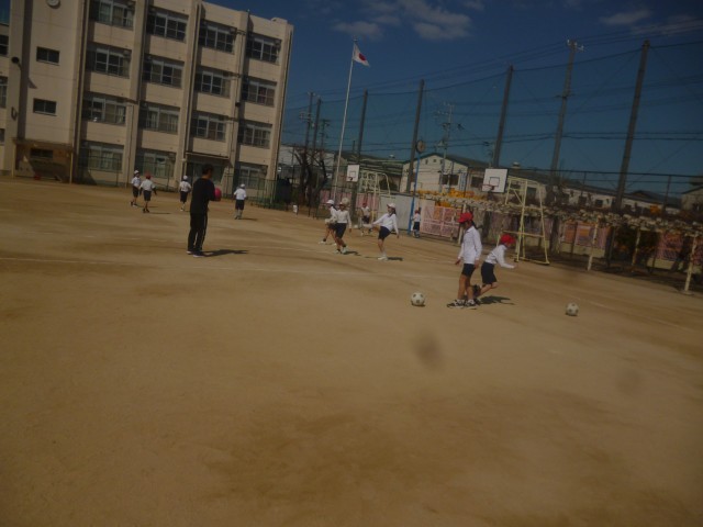 5年生は体育科に時間、サッカーに取り組んでいます。リフティングやパスの練習をしていました。この後、いよいよ試合を開始します。
