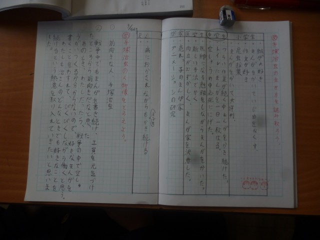 5年2組では国語科「手塚治虫」を学習してきました。本時では、これまで読み取ってきた手塚治虫の生きざまを通して、自分の考えと比較することで、学んだことをまとめていました。「~したところから、〇〇と思った。」「あのとき私だったら□□すると思います。」など、話型に気をつけていました。