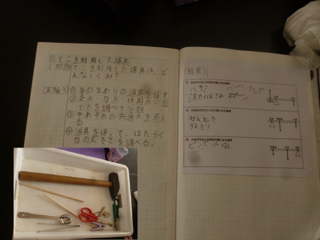 6年2組では理科の時間、てこを利用した道具について調べていました。はさみ・千枚通し・栓抜きなど、いろいろな道具を使って、木に刺さった釘を抜きます。それぞれの道具で、力点・支点・作用点はどこでしょうか?