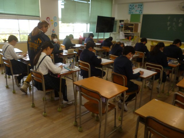 6年1組では「アロハ えだまめ」という詩を視写していました。ひらがなやカタカナをバランスよくマス目に書くことに加えて、「塩」「様」「最」「気」「幸」の漢字が使われていますが、「とめ」「はね」「はらい」「折れ」の部分を丁寧に書くように指導していただきました。