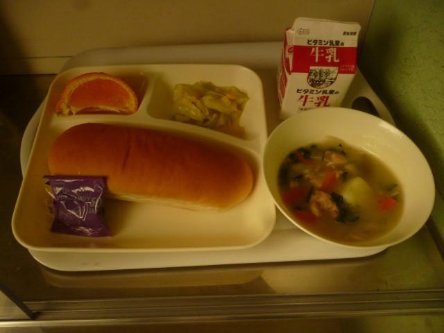 2月12日(木)の給食は、コッペパン・ブルーベリージャム・牛乳・鶏肉とほうれん草のシチュー・キャベツとコーンのサラダ・デコポンです。