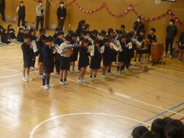 1年生からは歌「にじ」が、2年生からは演奏「マンボ№5」が、3年生からは演奏「パフ」が贈られました。