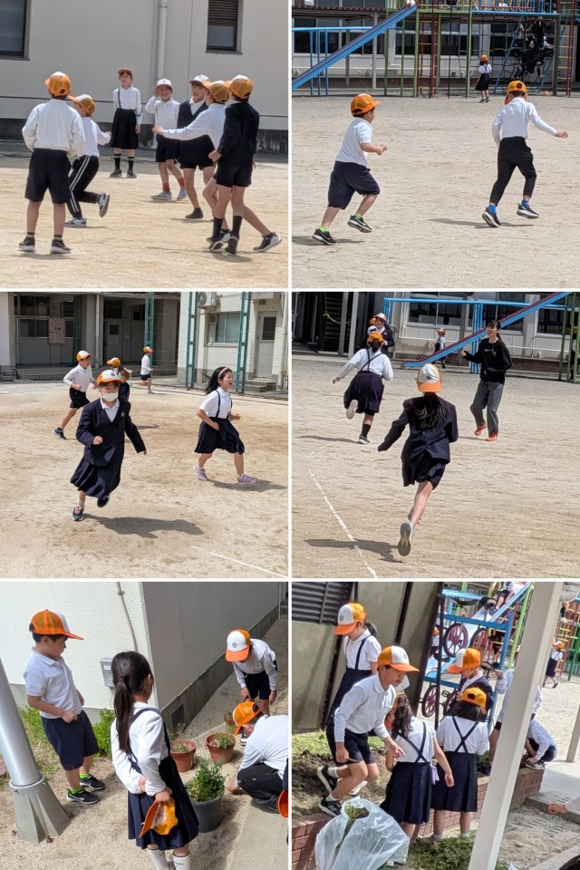 子どもたちは鬼ごっこをして元気いっぱいに駆け回っています。楽しい声が響いています。 -