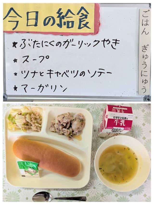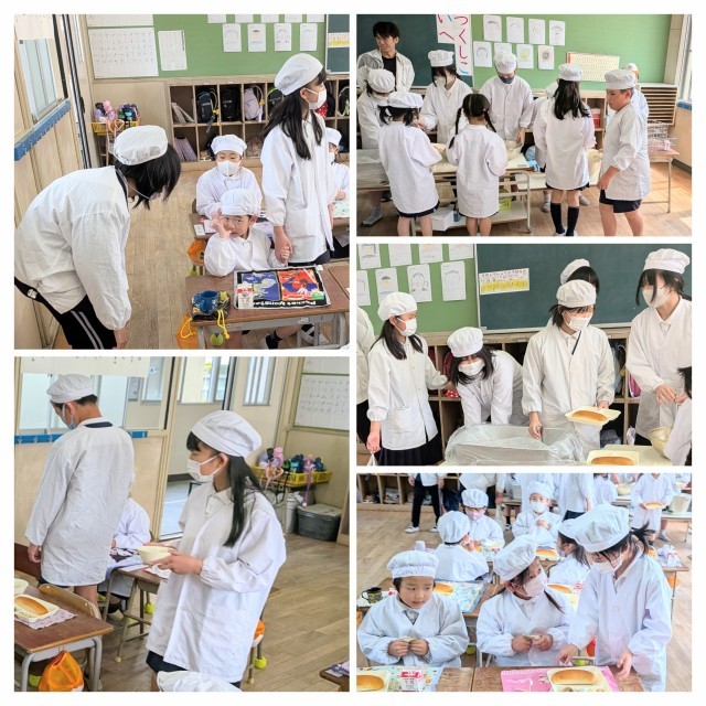 1年生の給食準備を6年生がお手伝い。白衣の着方や配膳の仕方を優しく教える姿は、さすが最高学年です。1年生も安心した様子で、一生懸命準備に取り組んでいました。頼もしいお兄さん・お姉さんのサポートを受けながら、楽しい給食の時間が始まります。 -