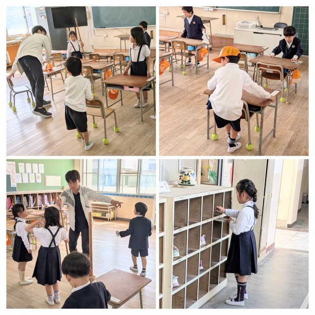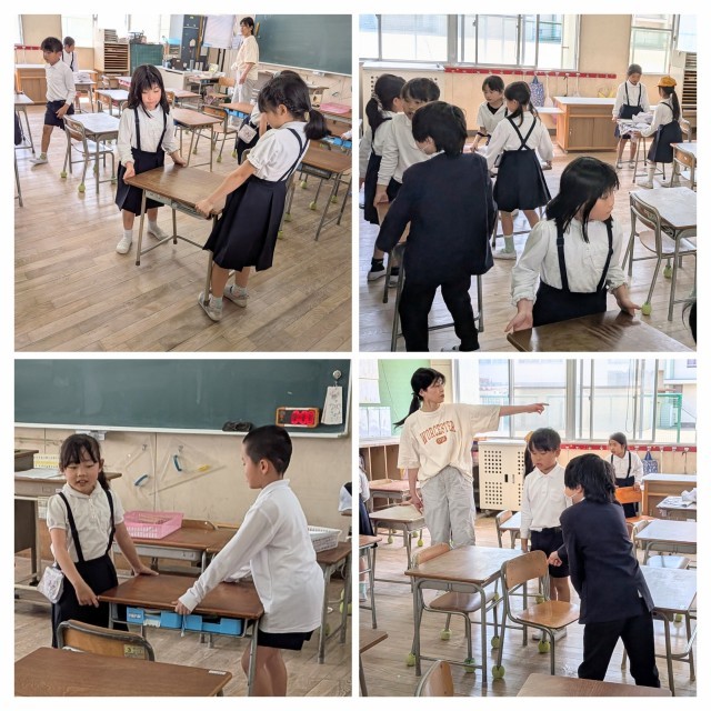 掃除の段取りを確認し、協力して机を運んでいます。自分たちの教室をきれいにしようと、誰もが一生懸命でした。 -