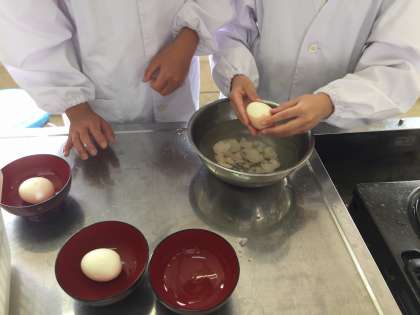 5年生が調理実習で「ゆで玉子」を作っていました。