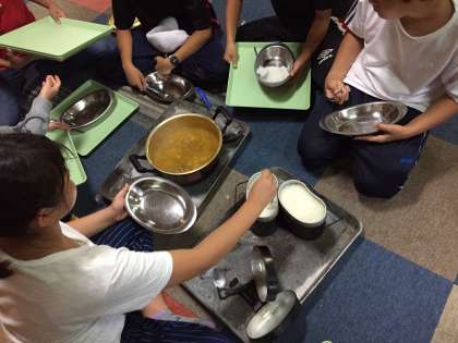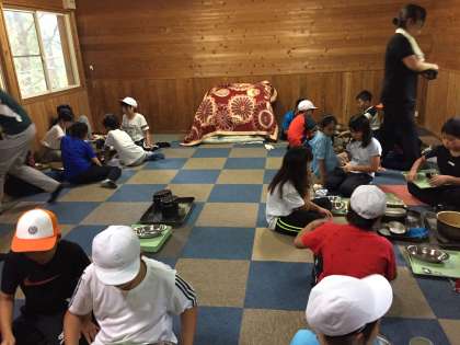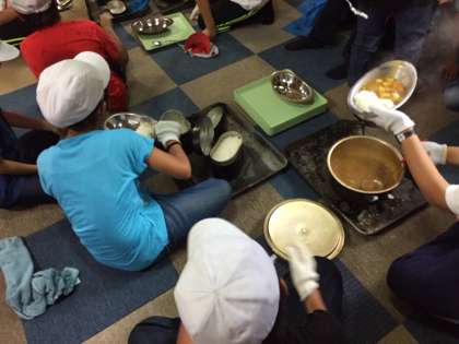 カレーが出来上がりましたが、少し雨が降ってきましたので、屋内に引き上げました。