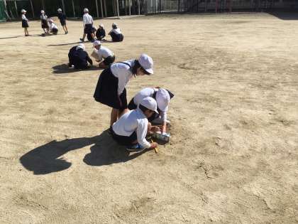 理科の授業で、日なたと日かげの地面の温度を調べました。温度計の使い方を学習し、興味津々で測っていました。