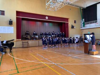 講堂に楽器を運び、全員での練習に取り組んでいます。一致団結し、素敵なメロディーを奏でられるように頑張ります。