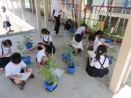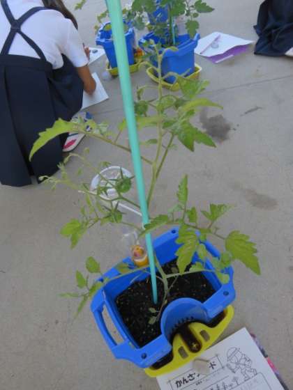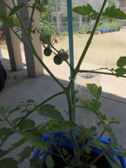 まだまだ青い状態ではありますが、トマトの形が確認できたので、子どもたちは大喜びです。
