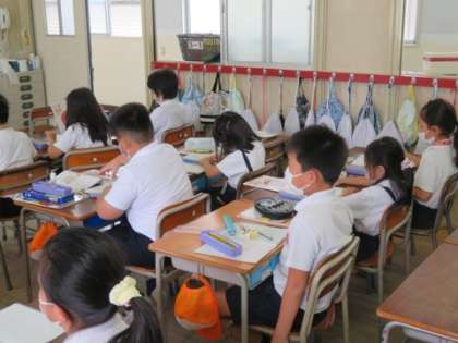 算数では、実物(具体物)の絵や物を使って問題場面を捉えた後、ブロック(半具体物)を使用して考えを深めていきます。