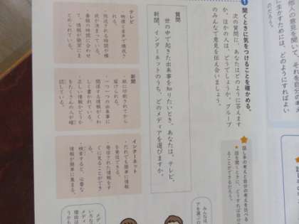 テレビ、新聞、インターネットを比べて、情報を得るにはどれが良いのかを、話し合っています。人の意見を聞いて、自分の考えを変えたり、深めたりしています。