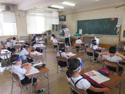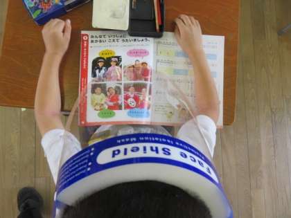 フェイスシールドを着用して学習しました。