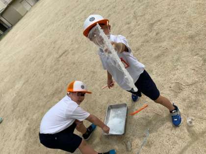 どのようにして作るのかを話し合ったときには、水に洗剤を入れるのは知っているようでしたが、砂糖もいれることには驚いた様子でした。(砂糖を入れると割れにくくなります)