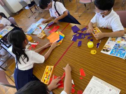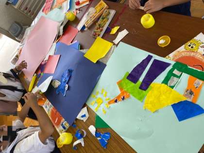 今日の図工では、色紙を破き、できた紙の形から想像を膨らませて作品にしました。
