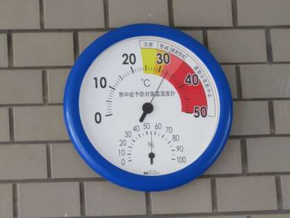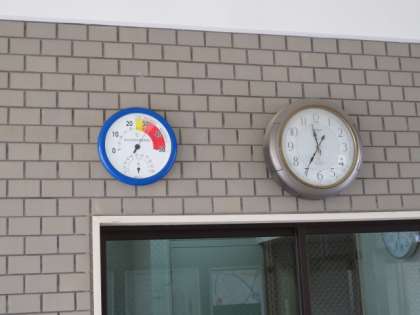 玄関ピロティ時計横に【熱中症予防対策温湿度計】を設置しました。
