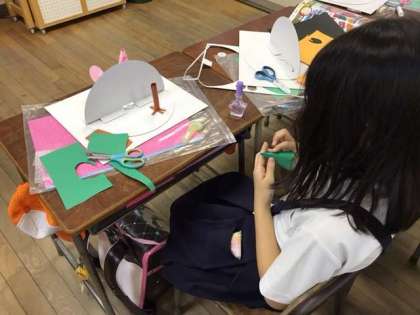 子ども達は、くるくる回る台紙に、折り紙や画用紙で木を作ったり、ペンで花火を書いたり、コーヒーカップを作って貼り付けたりしていました。