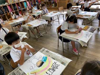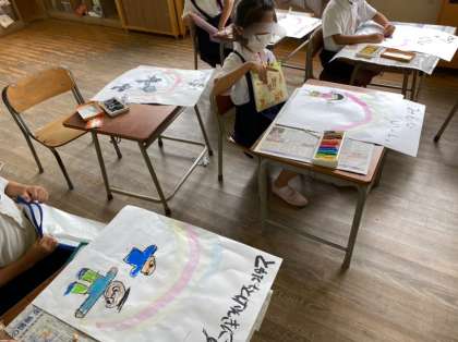 図工では、初めて絵の具を使いましたが、背景の虹をきれいな色に彩色できていました。