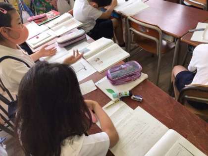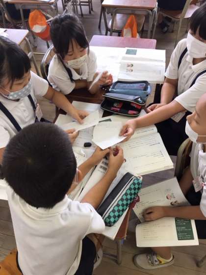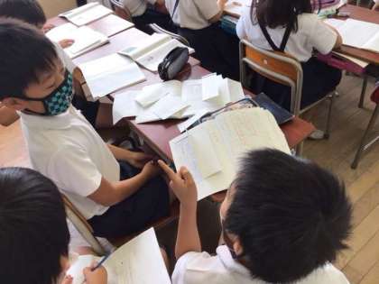 国語科の学習で、運動会の時にみんなで頑張れるような合言葉を考える学習をしています。自分の意見を発表をして、司会を中心に話をまとめました。