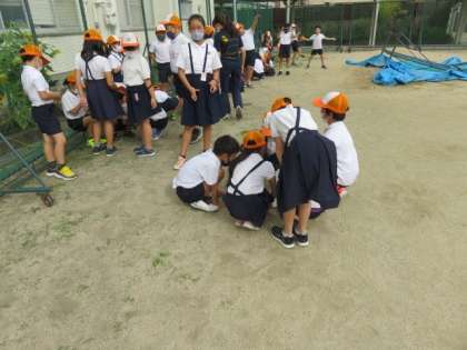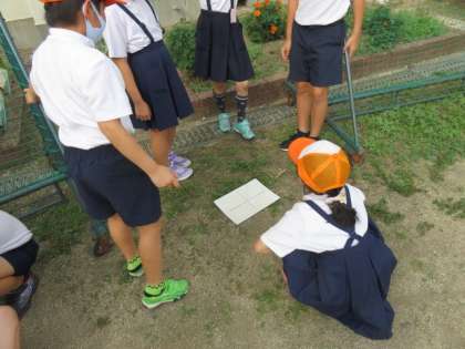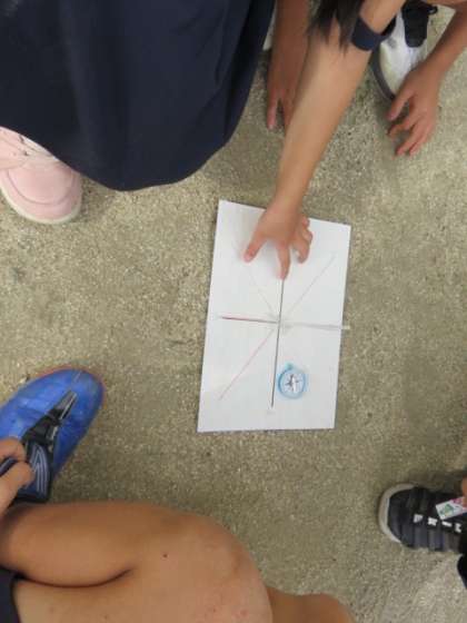 決まった時間に運動場に出て、太陽とかげの関係性や動きを調べています。