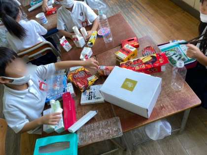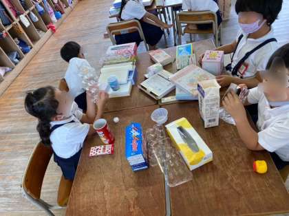 おうちから持ってきた箱を並べたり、くっつけたりして、できる形を試しながら考えました。