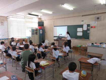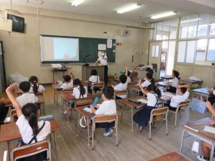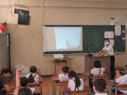 子どもたちと同じプリントをプロジェクターで大きく映し出し、間違いがないように丁寧に進めていました。