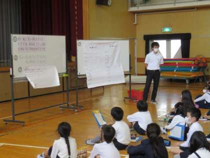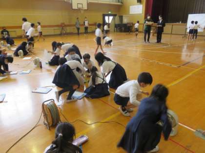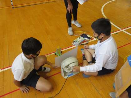 子どもたちは弱い風の時と強い風の時の車の走る距離をそれぞれ測り、比較していました。班で協力して実験している姿が印象的でした。