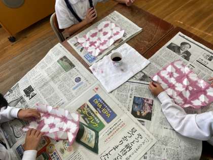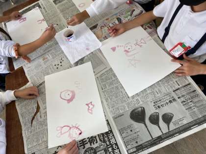 和紙を三角に折って、端に色水をつけてみたり、綿棒を使って好きな絵を描いてみたりと、2つの作品を作ることができていました。