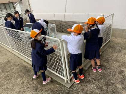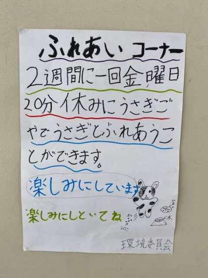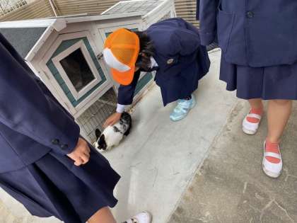 環境委員会の取り組みで、2週間に1回、20分休みにうさぎと触れ合えます。
