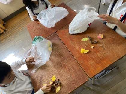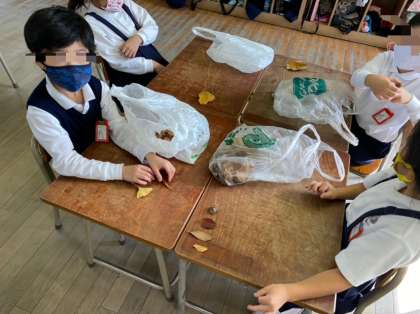 みんなが泉尾公園で拾ってきた落ち葉などを机の上に並べて、これらを使ってどんなものを作ることができるか話し合いました。