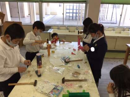 作品展に向けて立体作品を作っています。トンカチを使ってくぎを打っている様子です。初めて握るトンカチに、はじめはドキドキしている様子でした。指を打たないように気をつけながら作業していました。