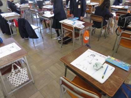 4年生 図画工作科 「○○をしながら指さすAさん」というテーマで、表情やしぐさを表現していました。相互鑑賞をして学び合っていました。