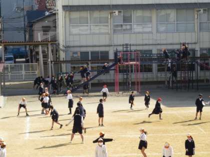 6年生 休み時間に元気よく遊んでいました。本校は最高学年が運動場で思い切り楽しく遊んでいるので、下級生も見習って良く遊んでいます。